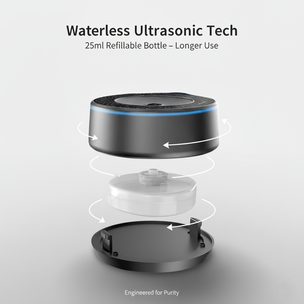 Elevate your driving experience with this innovative air freshener that combines luxury and convenience. Enjoy effortless fragrance without water, thanks to its smart design and ultrasonic technology.